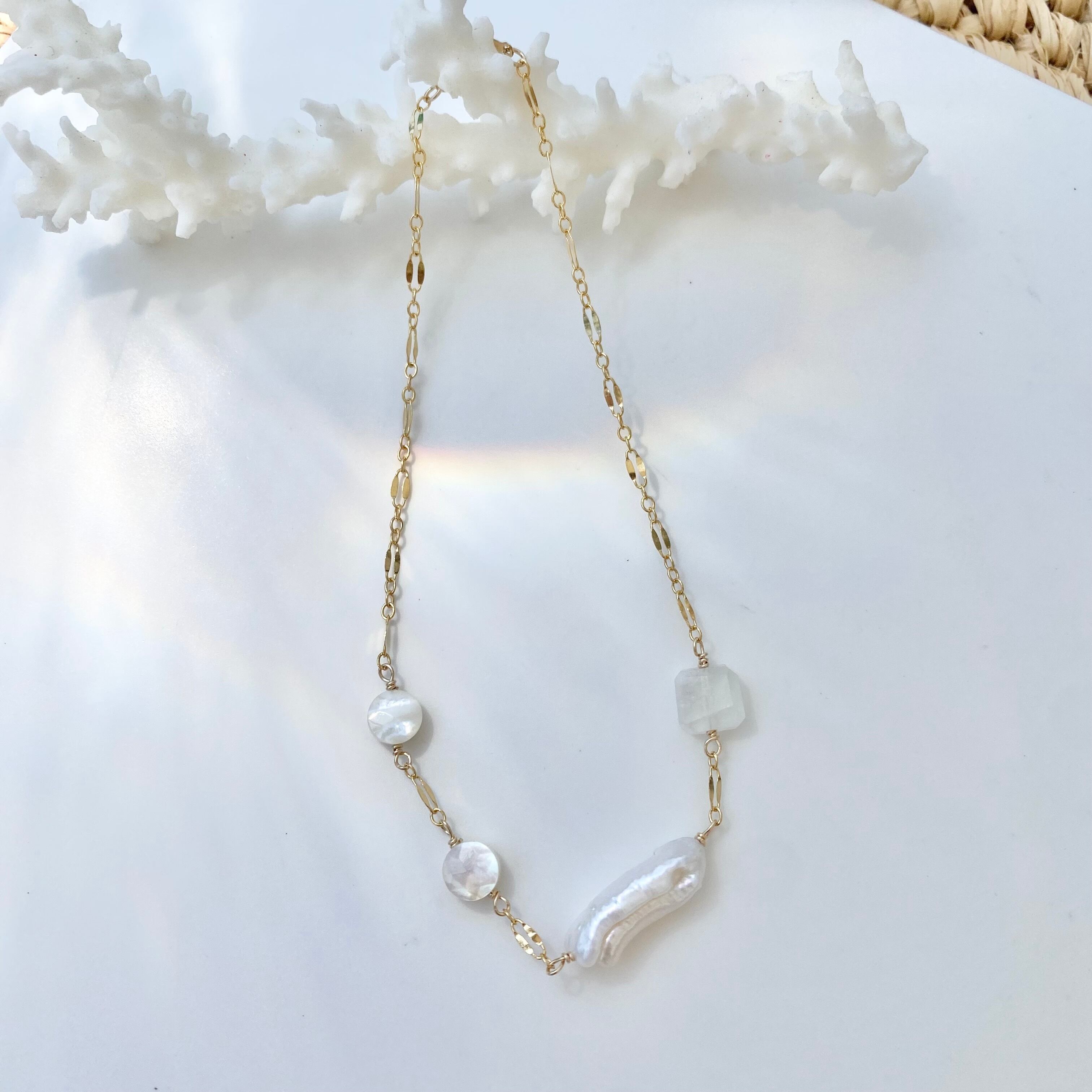 ケシパール×ホワイトシェル×レインボームーンストーンで制作したアンクレット♡